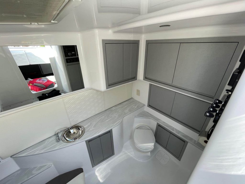 • Cabin: A refined interior featuring custom materials, bench seating, and a dedicated head with high-end finishes.
